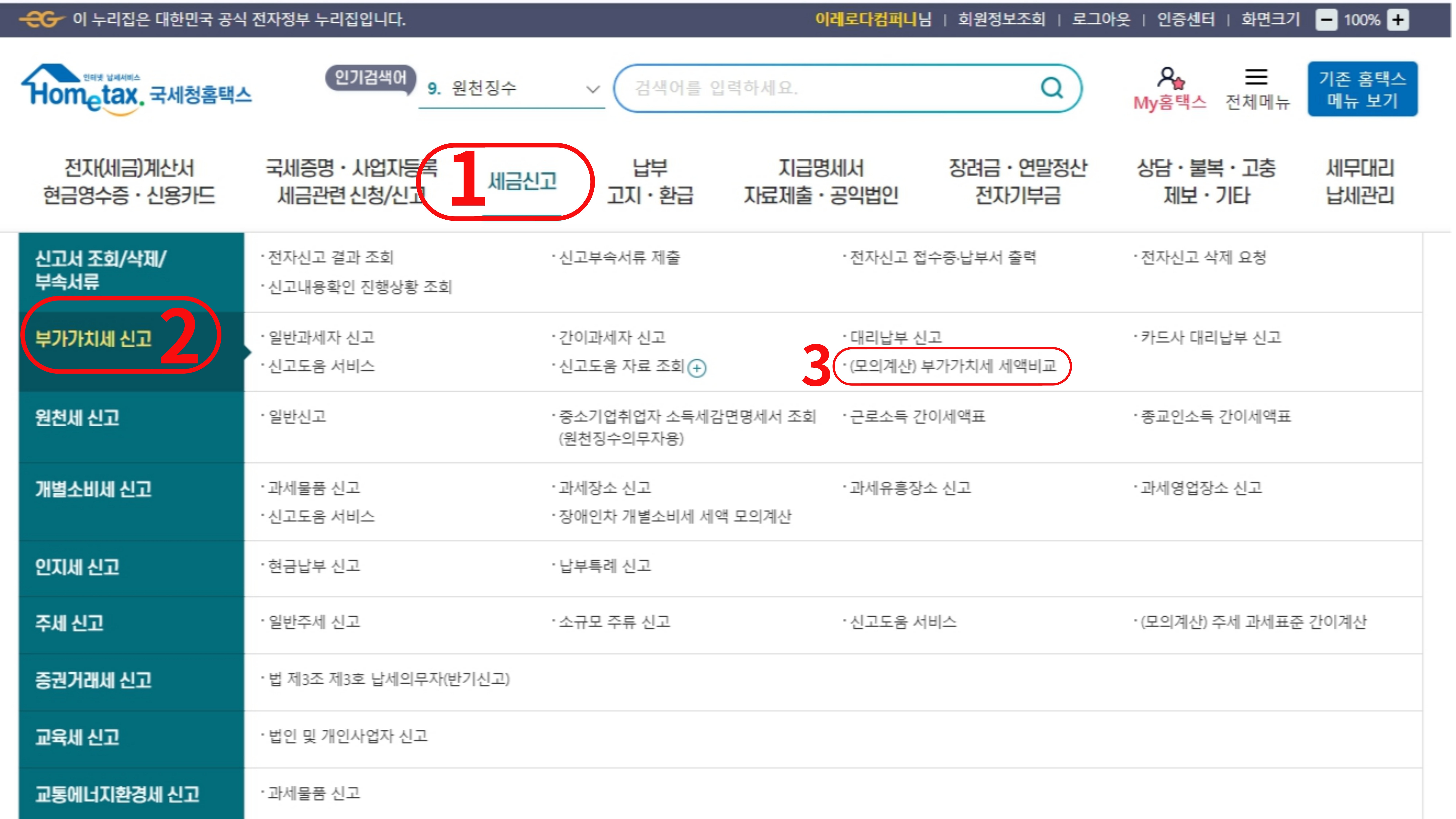 ✅ 만약 '부가가치세 신고' 탭이 없다면, 사업자 아이디로 로그인이 되어 있는지 확인해 보시기 바랍니다.